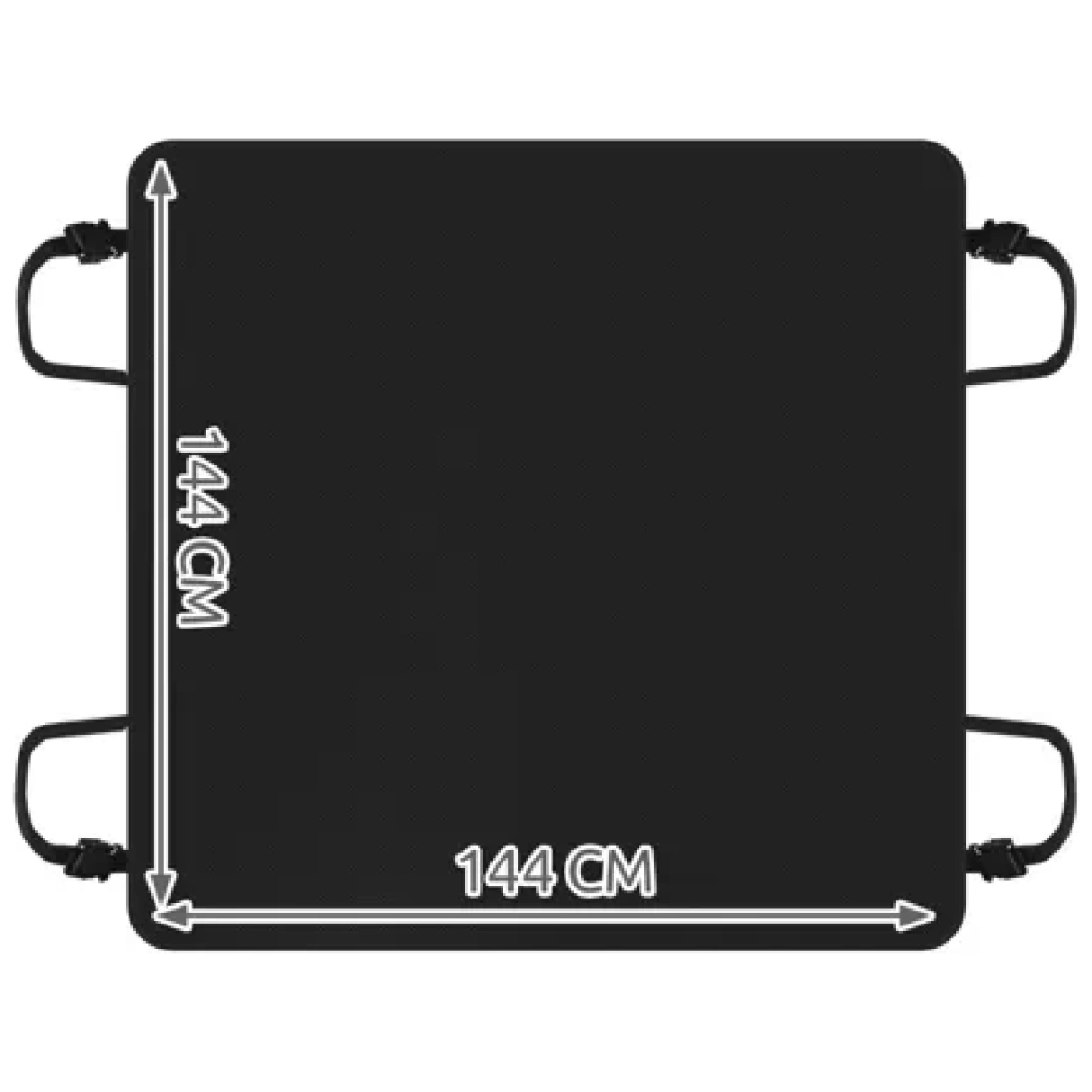 - SPETSIFIKATSIOON – värv: must; vööaugud: jah; materjal: välis-/sisekate: PVC-ga kaetud 600D Oxfordi kangas, muud elemendid: polüpropüleen + PP; Mõõdud: 144 x 144 cm; kaal: 709 g; Pakendi kaal: 715 g.