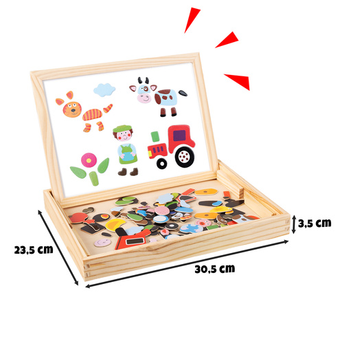 108 värvilist magnetilist detaili pakuvad lõputuid mänguvõimalusi ning aitavad arendada peenmotoorikat, loogilist mõtlemist, keskendumist ja kujutlusvõimet. Praktiline puidust alus toimib ühtaegu nii mängualuse kui ka hoiukarbina, hoides kõik tarvikud korras.