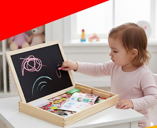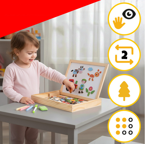 Kahepoolne magnetiline õppetahvel on loominguline ja arendav mänguasi lastele alates 3. eluaastast. Ühel poolel on magnetiline kuivkustutuspind, teisel pool kriiditahvel – ideaalne joonistamiseks, magnetitega mängimiseks ja lugude loomiseks.