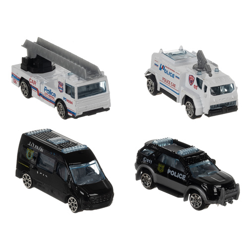 Komplektis 4 erinevat politseiautot, mida saab lennukisse paigutada, väravatest välja sõita või raketist lasta.