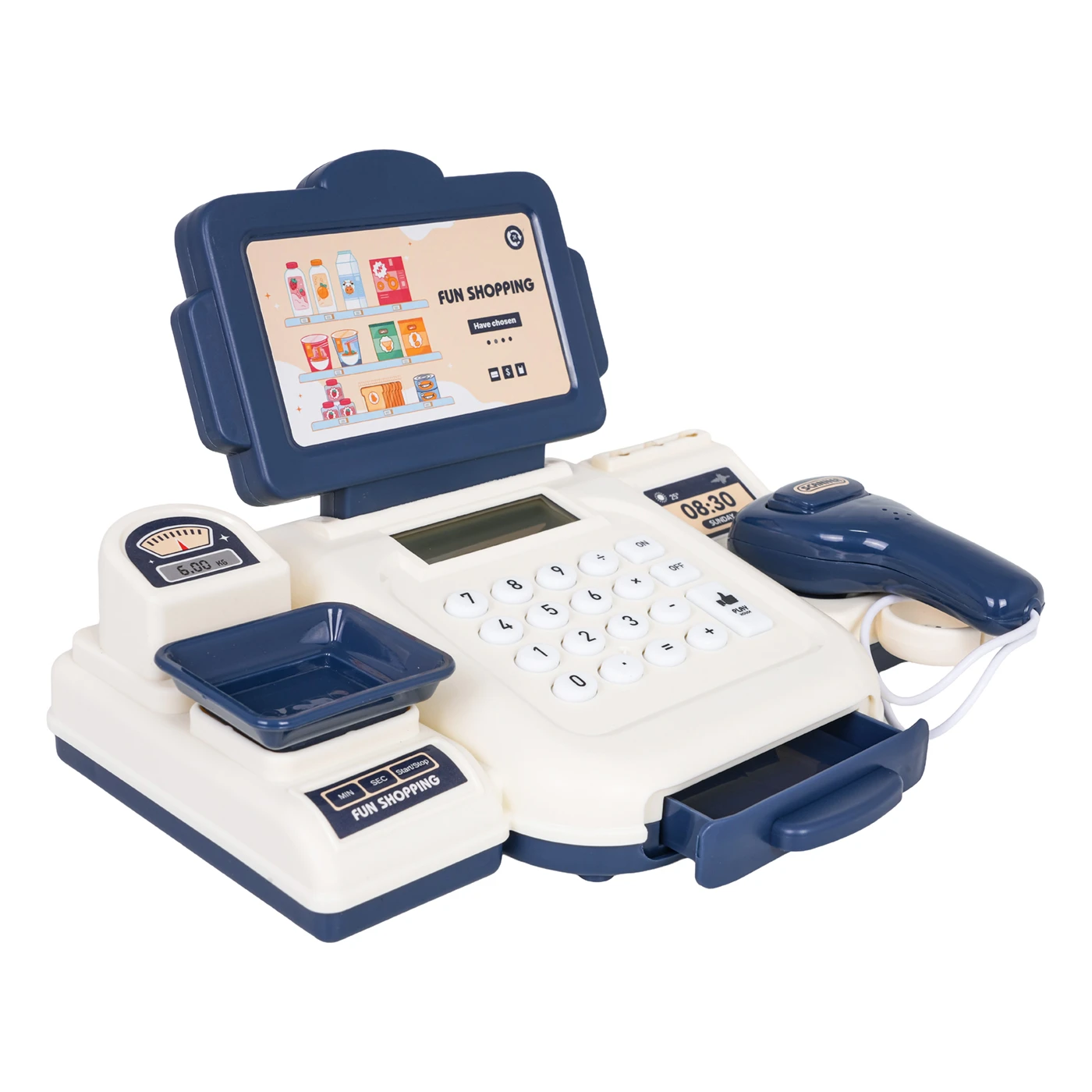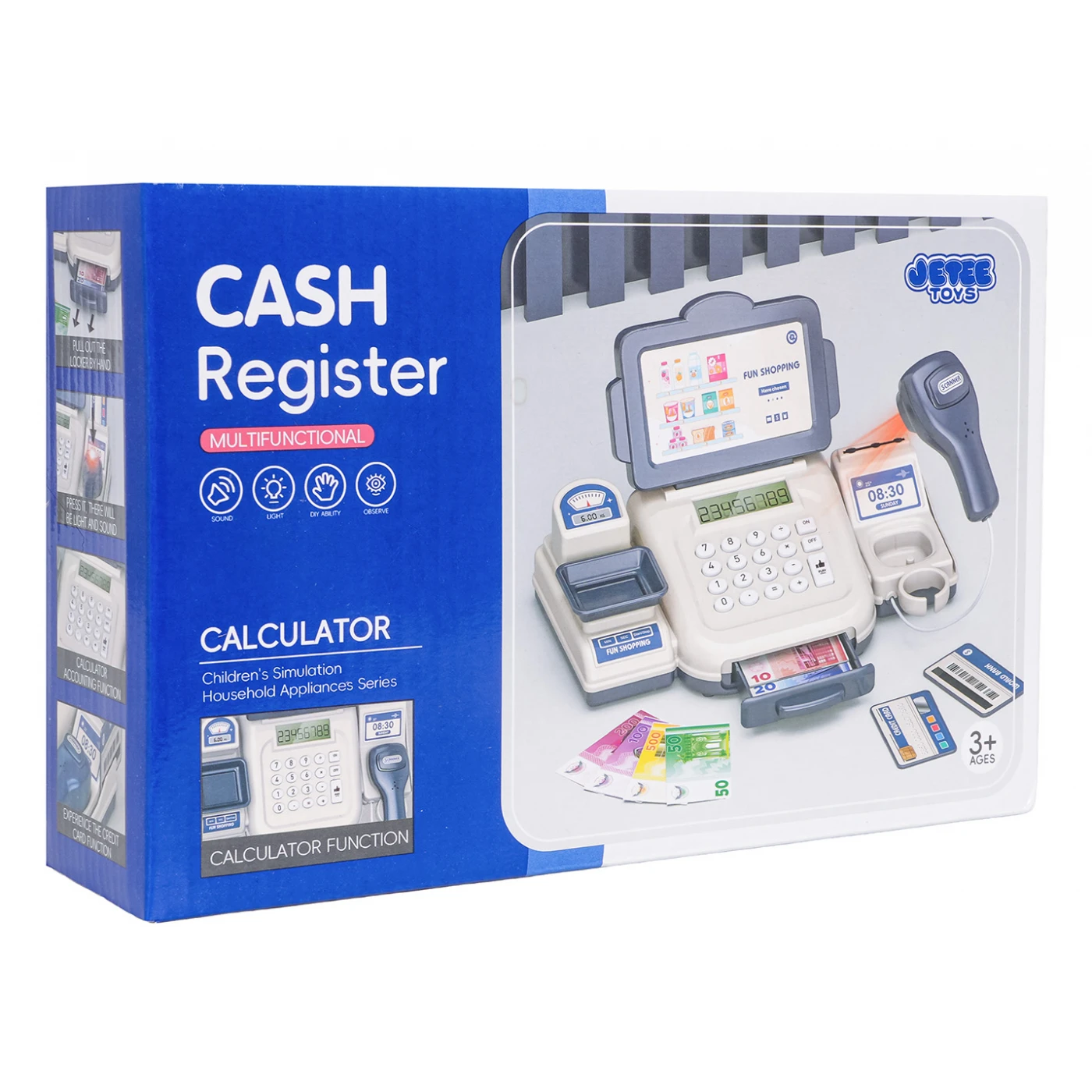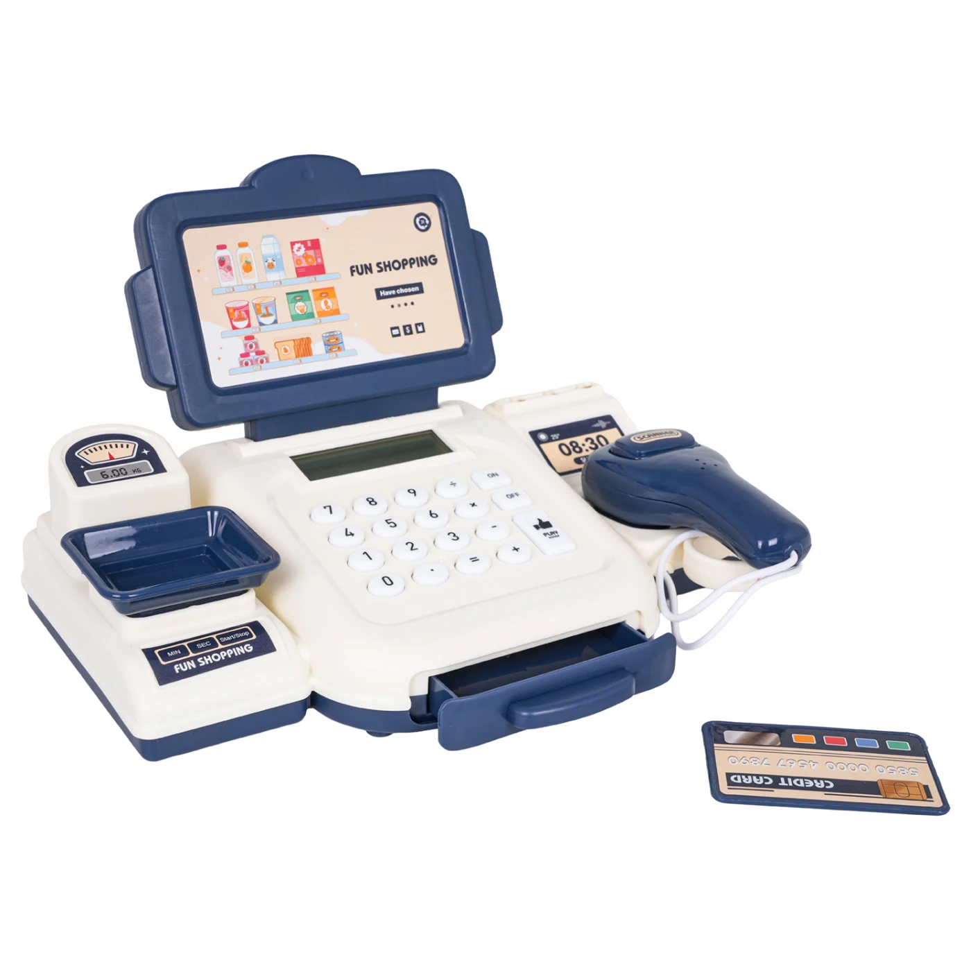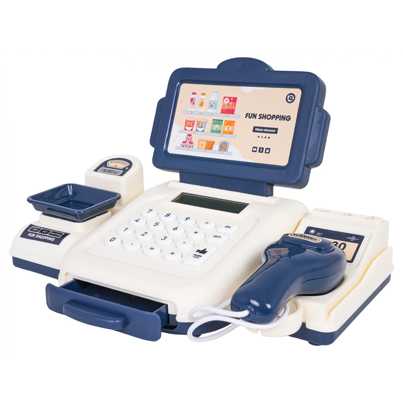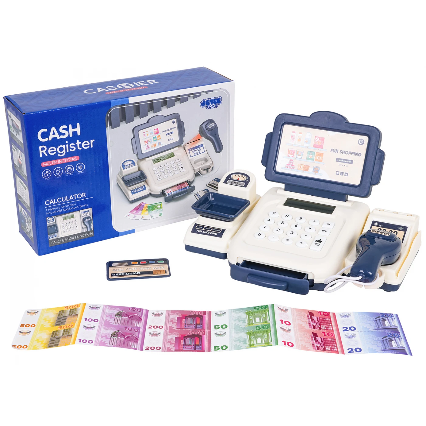 Interaktiivne kassa koos lisatarvikutega lastele vanuses kolm aastat ja vanemad. Komplekt on valmistatud kvaliteetsetest ja lapsesõbralikest materjalidest. Kassas on kaal, avatav rahasahtel, kalkulaator, maksekaart ja skanner. Skanneril on heli- ja valgusfunktsioonid. Kalkulaator piiksub iga nupu vajutamisel. Kassas on ka sularaha nimiväärtustega 500, 200, 100, 50, 20 ja 10 ning maksekaart. Mänguasja toiteallikaks on 2 x AA 1,5 V patareid (patareid ei kuulu komplekti).