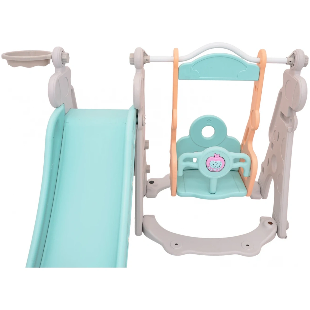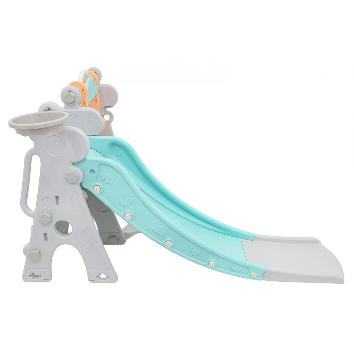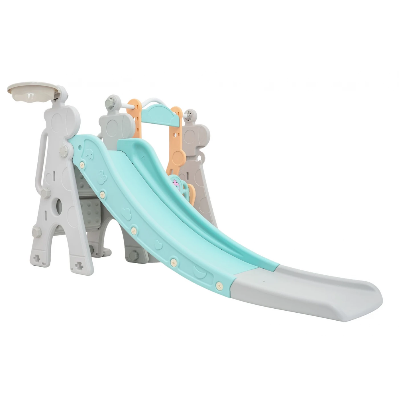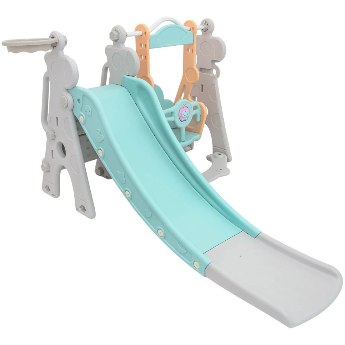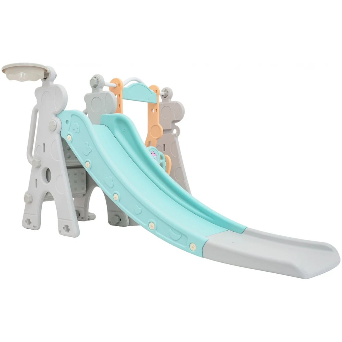 3-ühes komplekt, liumägi, kiik, korvpall lastele alates 1. eluaastast. Kõik komplekti elemendid on valmistatud kvaliteetsest HDPE materjalist, mis on paindlikum ja mehaaniliste kahjustuste suhtes vastupidavam võrreldes teistes sarnastes konstruktsioonides kasutatavate materjalidega. Suured komponendid hõlbustavad kokkupanekut. Komplekt sobib ideaalselt nii õues kui ka siseruumides kasutamiseks.