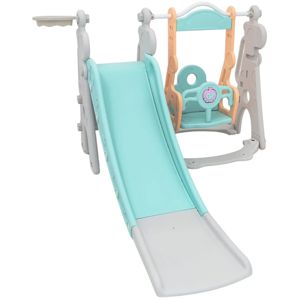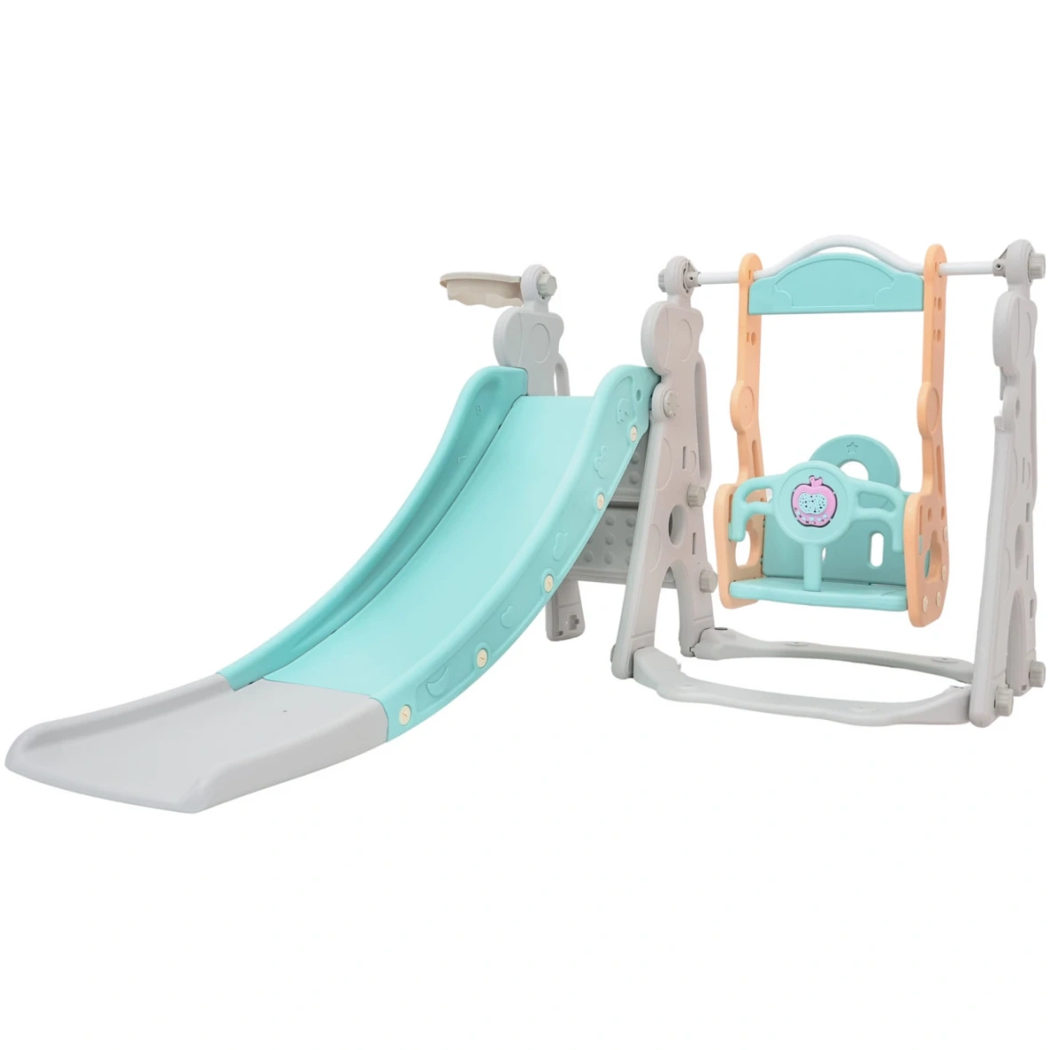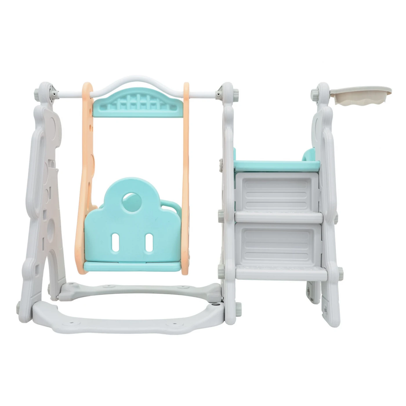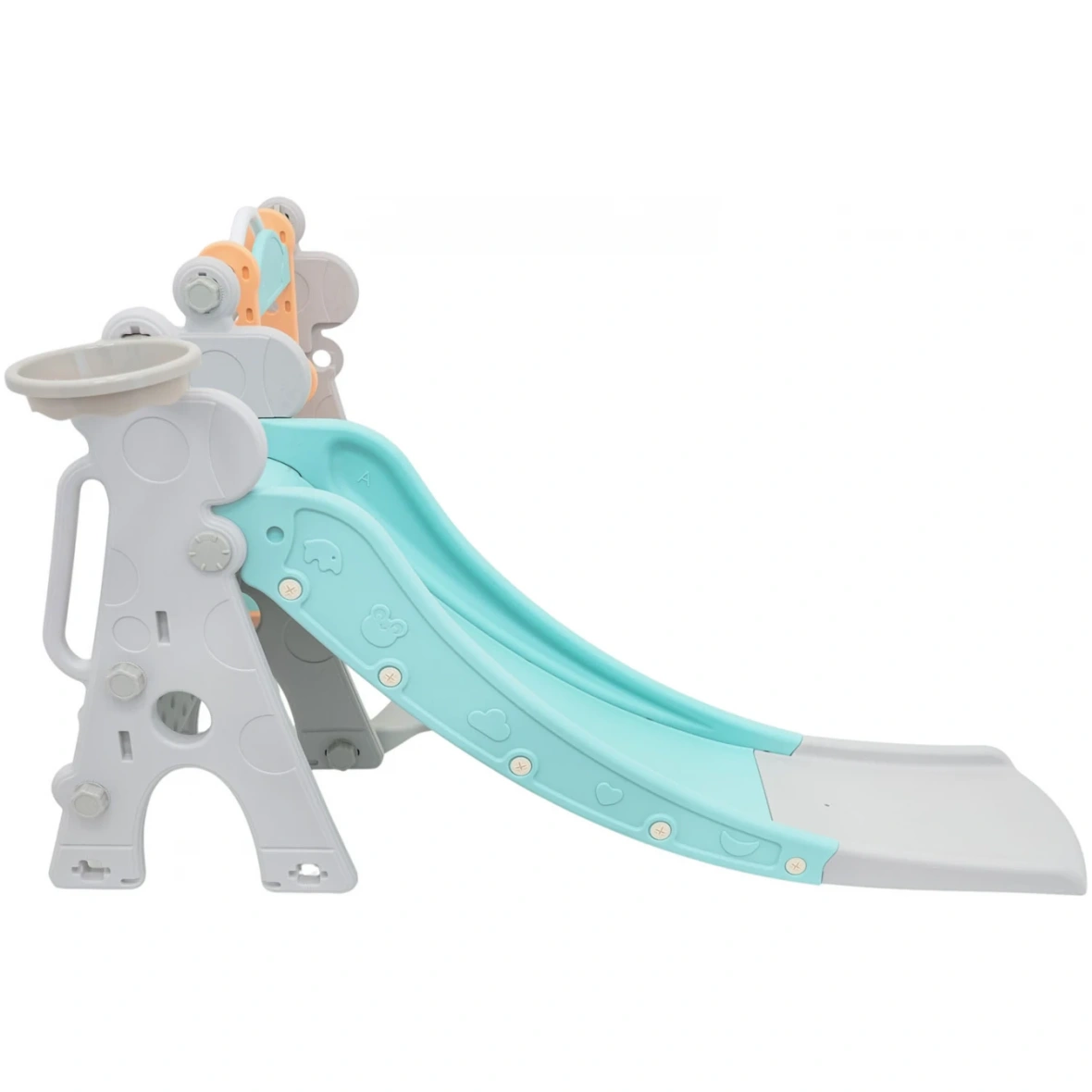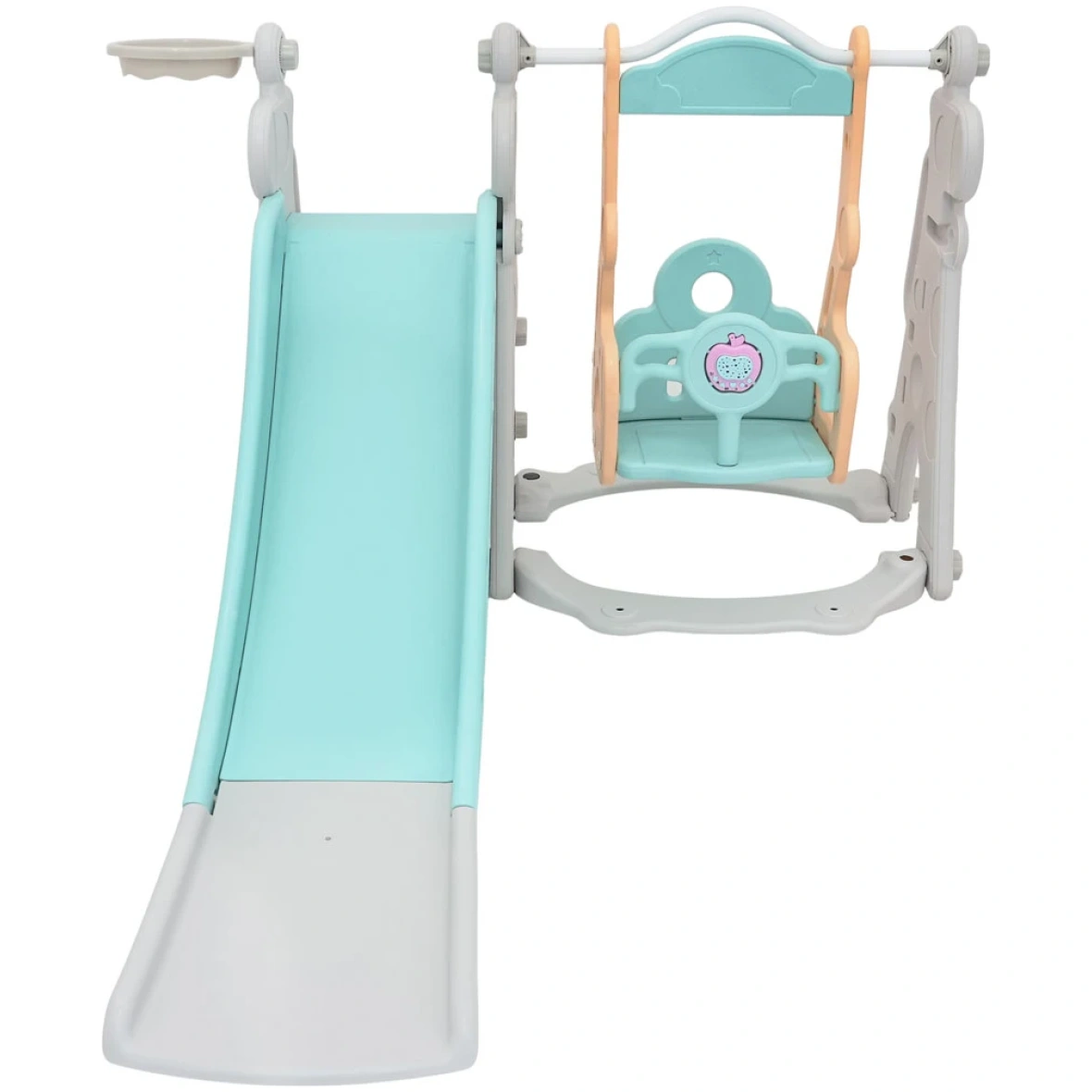 3-ühes komplekt, liumägi, kiik, korvpall lastele alates 1. eluaastast. Kõik komplekti elemendid on valmistatud kvaliteetsest HDPE materjalist, mis on paindlikum ja mehaaniliste kahjustuste suhtes vastupidavam võrreldes teistes sarnastes konstruktsioonides kasutatavate materjalidega. Suured komponendid hõlbustavad kokkupanekut. Komplekt sobib ideaalselt nii õues kui ka siseruumides kasutamiseks.