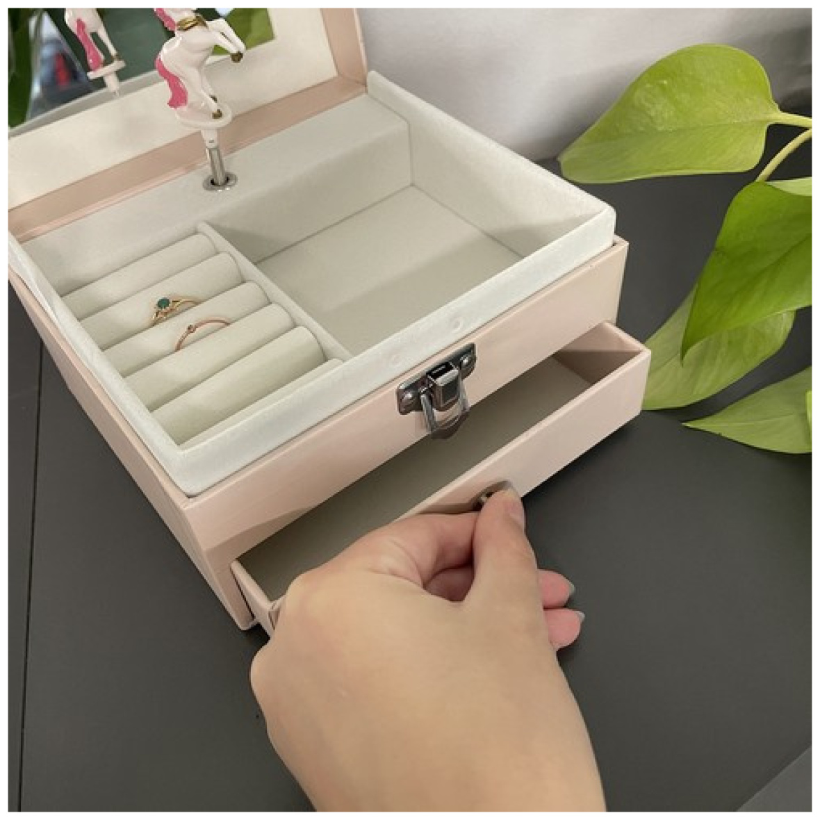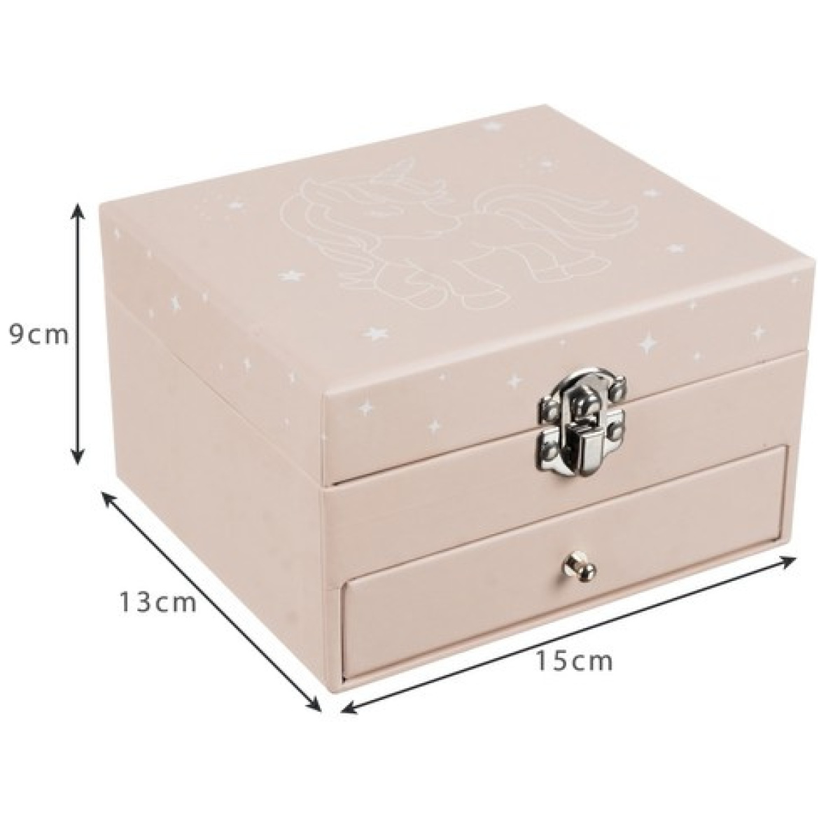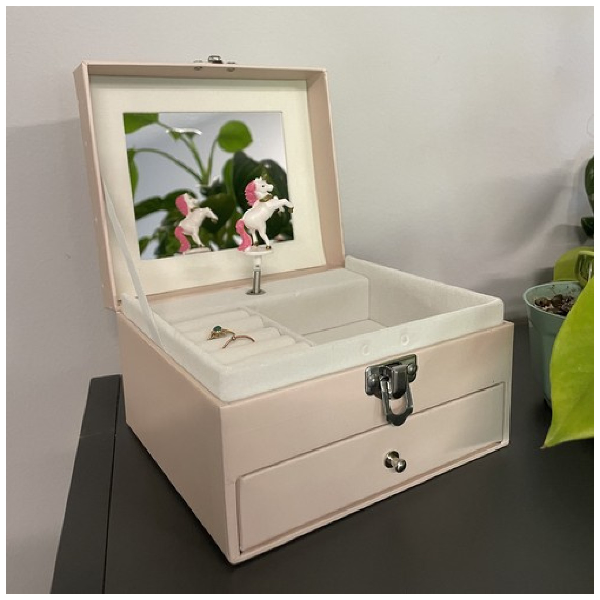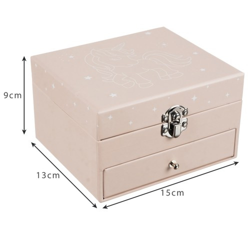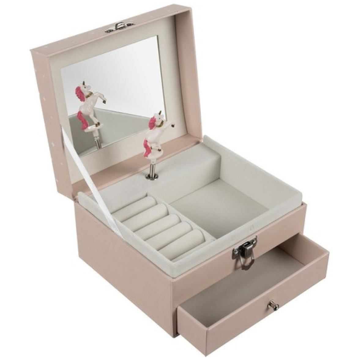 Karp aarete hoidmiseks – iga tüdruku aarded väärivad erilist kohta. Pastellroosa, ükssarviku ja tähtede motiiviga kaunistatud muusikakarp on ideaalne koht kõigi teie väikeste nipsasjakeste hoiustamiseks. Karp on valmistatud vastupidavast papist ja sisaldab viit sektsiooni sõrmuste ja kõrvarõngaste jaoks ning sahtlit, mis pakub lisaruumi suveniiride ja teiste väärtuslike esemetega hoiustamiseks.