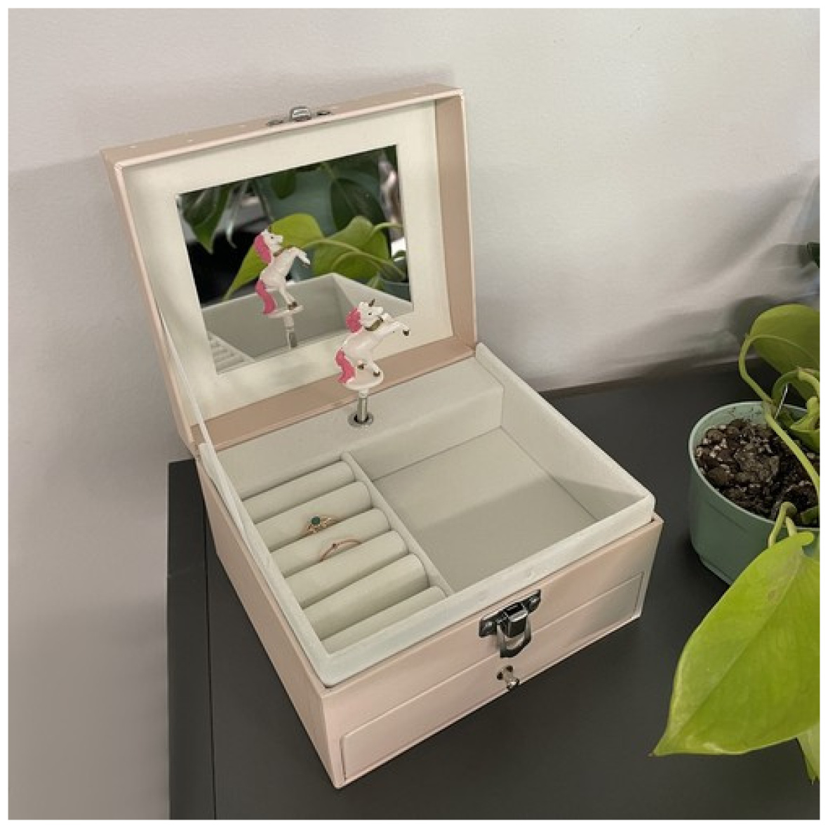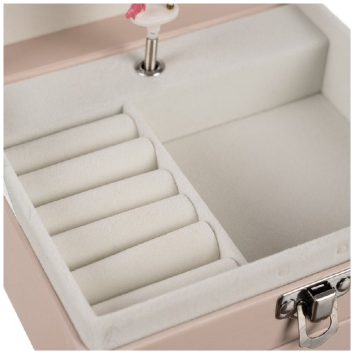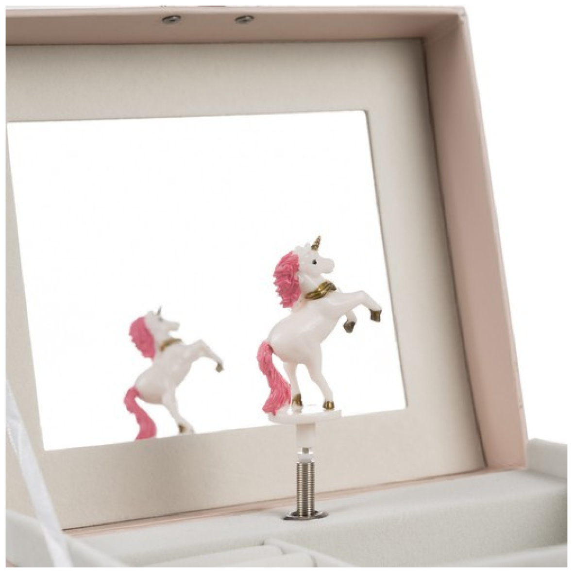 Pöörlev ja mängiv muusikakarp – karbi kõige erilisem element on maagiline muusikakarp, mis mängib pehme ja rahustava meloodia. Kui kaas tõstetakse, aktiveerub muusikakarp ja ükssarvik pöörleb õrnalt meloodia rütmis, luues õhku veelgi rohkem võlu ja unistuste atmosfääri. Kui meloodia lõppeb, keerake lihtsalt muusikakarp uuesti üles, et nautida seda uuesti!