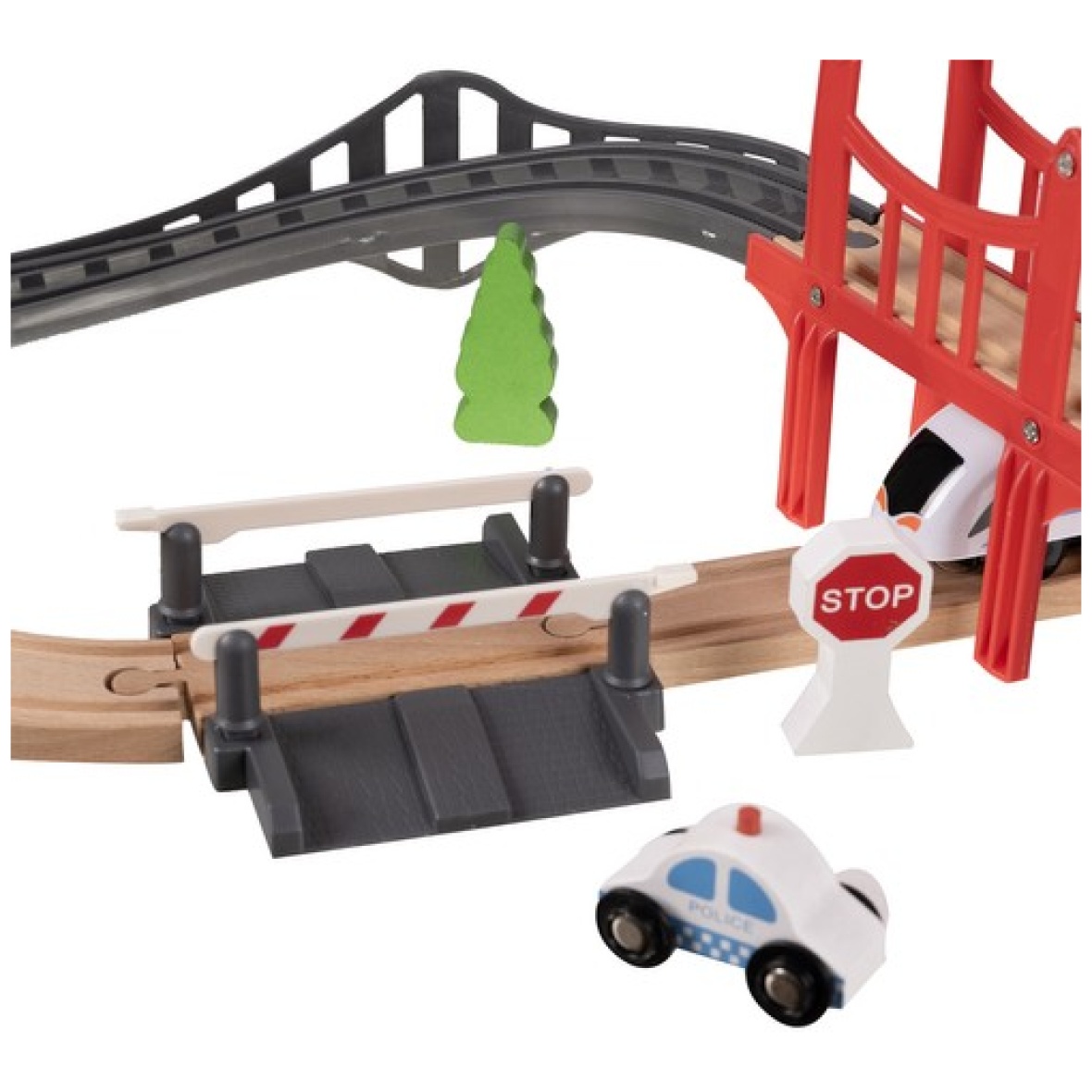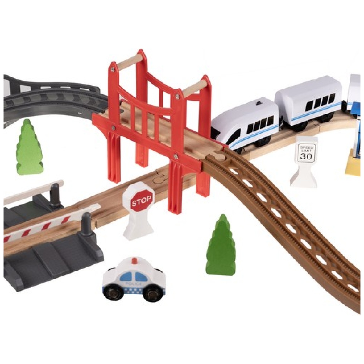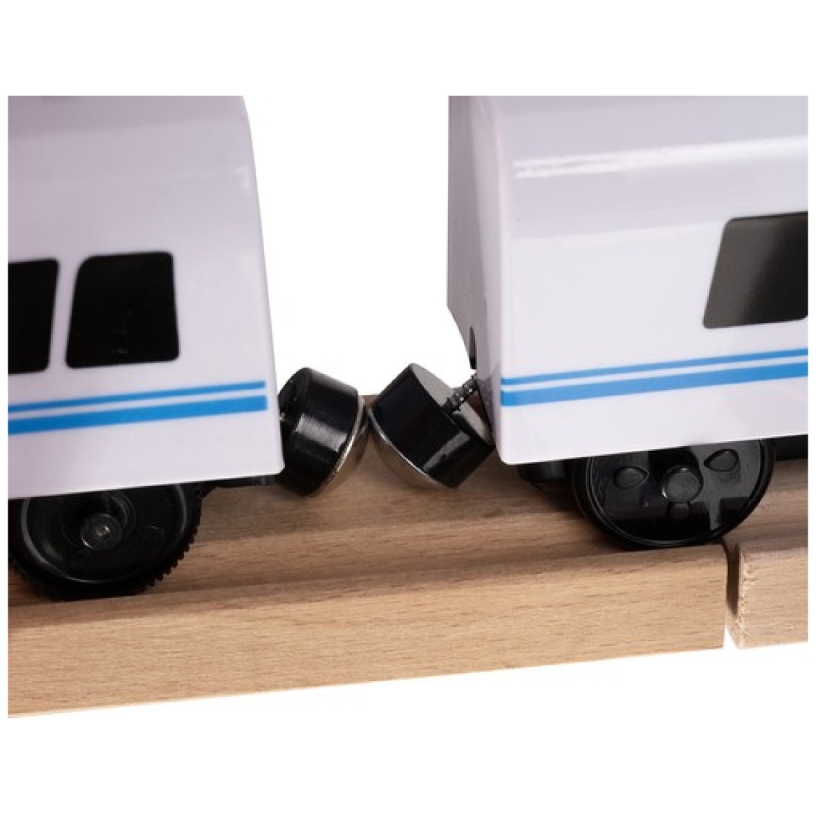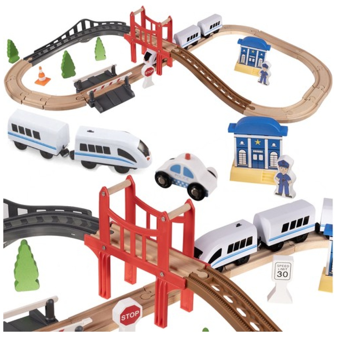 37 ELEMENTI – komplekt koosneb 37 täpselt valmistatud ja kenasti viimistletud elemendist, mida saab oma ideede järgi järjestada. Komplektis on reisirongi rada, politseiauto, puude ja siltide komplekt, politseinik, sildid ja palju muud. Rongi ja rongi elemendid on ühendatud magnetitega – puuduvad tarbetud konksud, mis võiksid ära murduda ja tekitada lapsele pidevaid probleeme komplekti lahtiühendamisega. Magnetid on tugevad – ei lase lahti isegi siis, kui kogu komplekt on üles tõstetud.