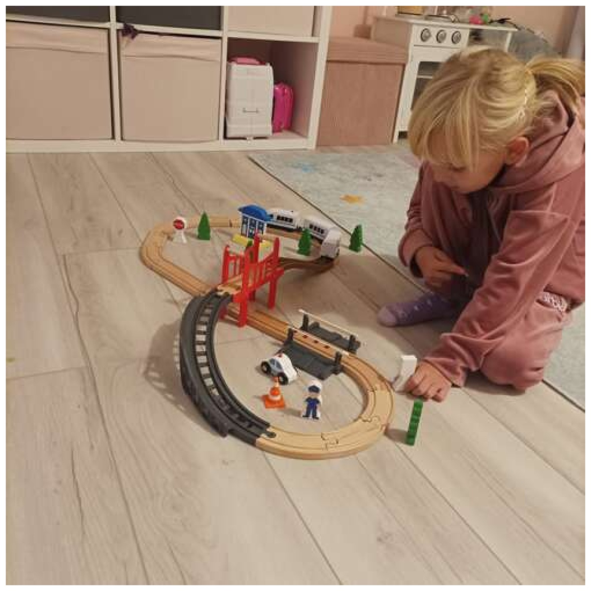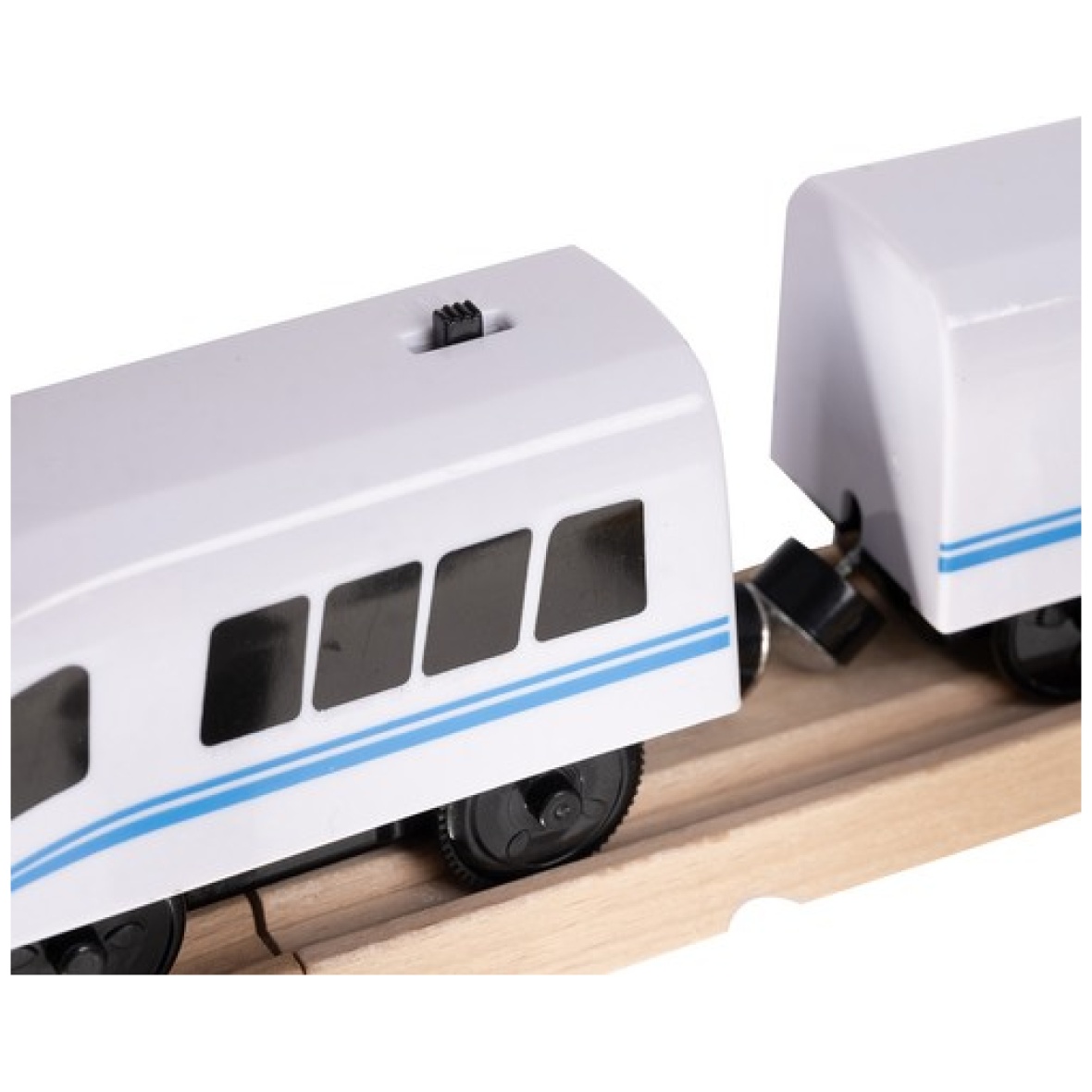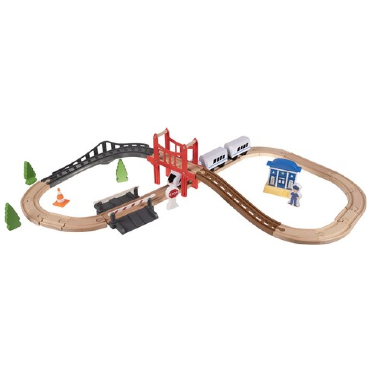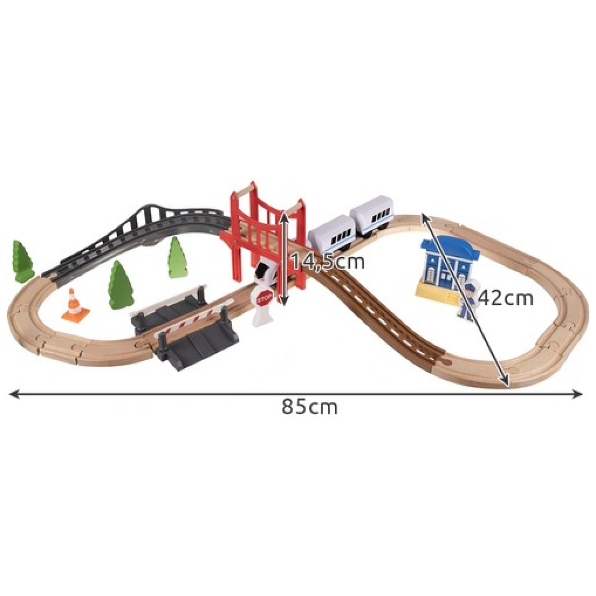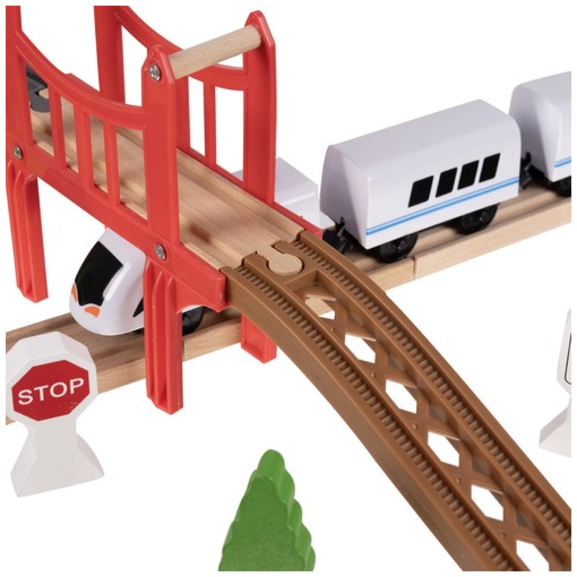 37 ELEMENTI – komplekt koosneb 37 täpselt valmistatud ja kenasti viimistletud elemendist, mida saab oma ideede järgi järjestada. Komplektis on reisirongi rada, politseiauto, puude ja siltide komplekt, politseinik, sildid ja palju muud. Rongi ja rongi elemendid on ühendatud magnetitega – puuduvad tarbetud konksud, mis võiksid ära murduda ja tekitada lapsele pidevaid probleeme komplekti lahtiühendamisega. Magnetid on tugevad – ei lase lahti isegi siis, kui kogu komplekt on üles tõstetud.