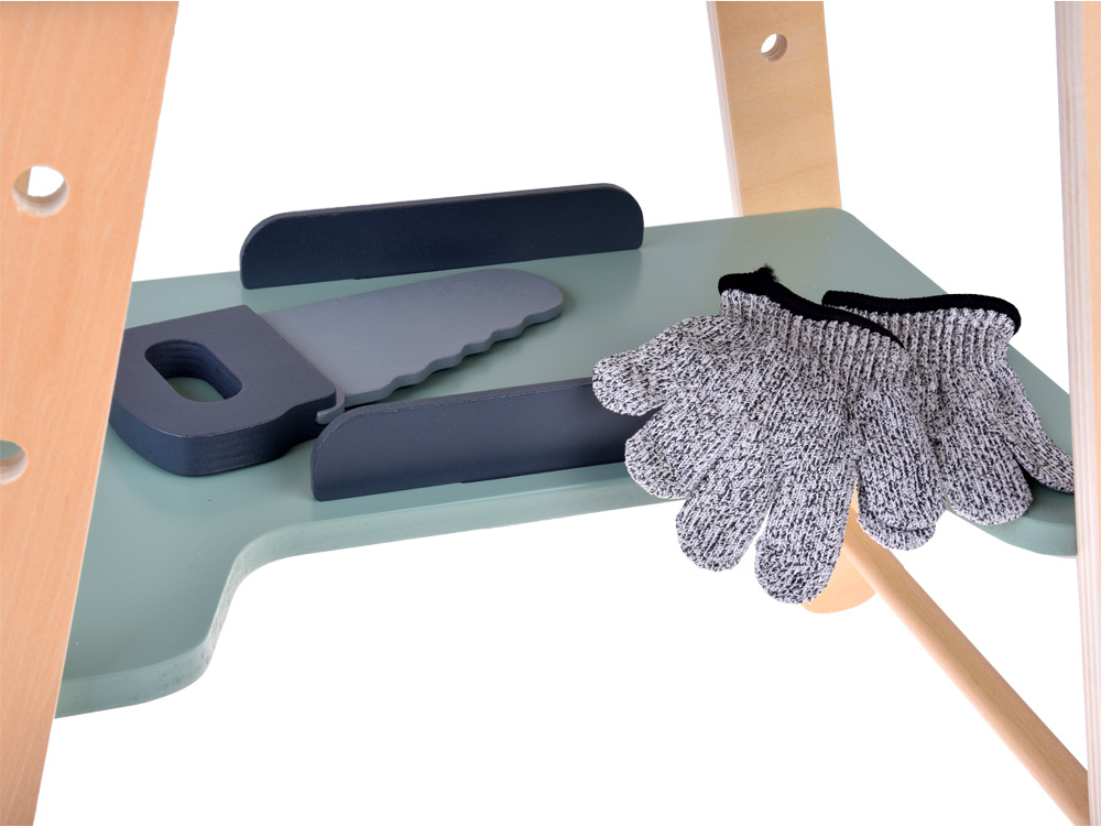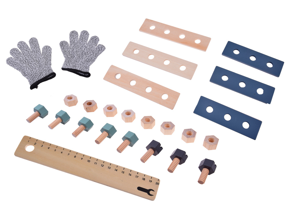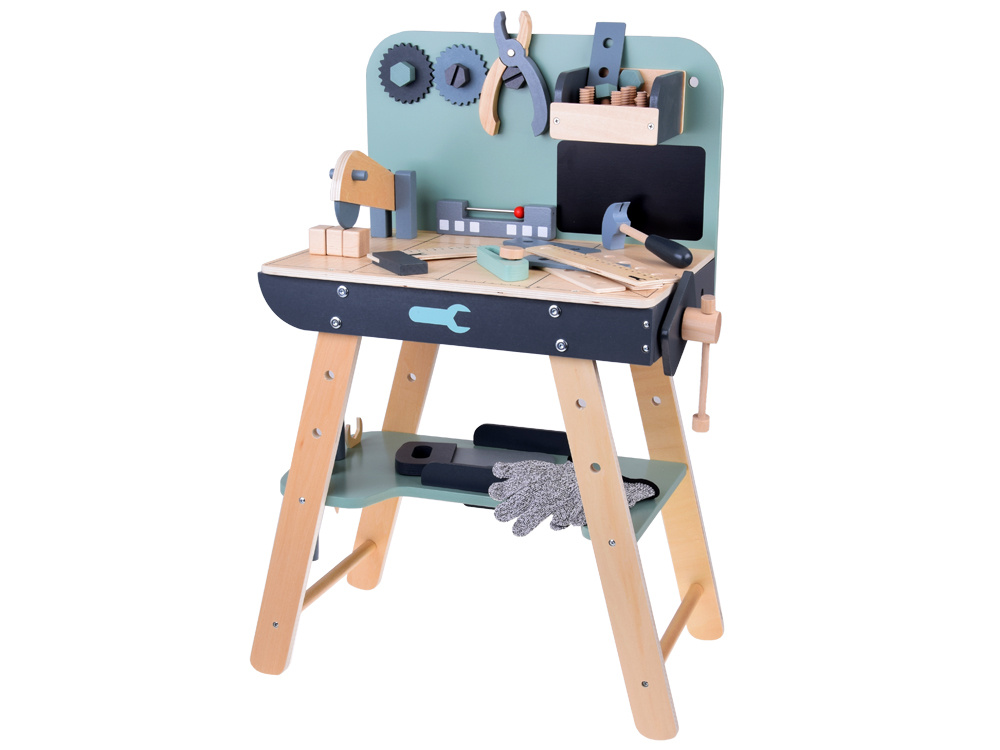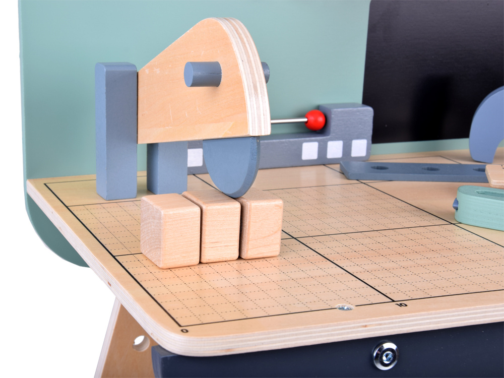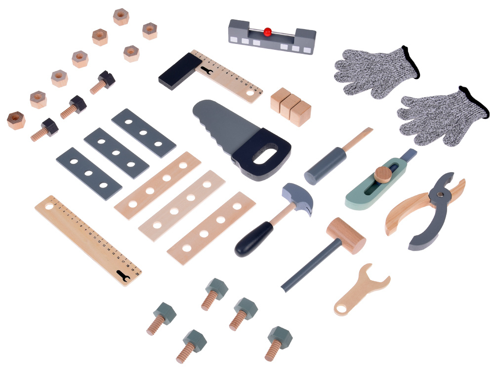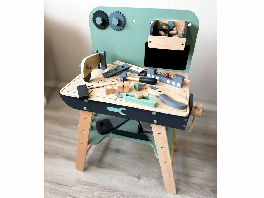 Tööriistapink on rikkalikult varustatud – laps saab kasutada erinevaid kruvisid, mutreid, laudu ja tööriistu: