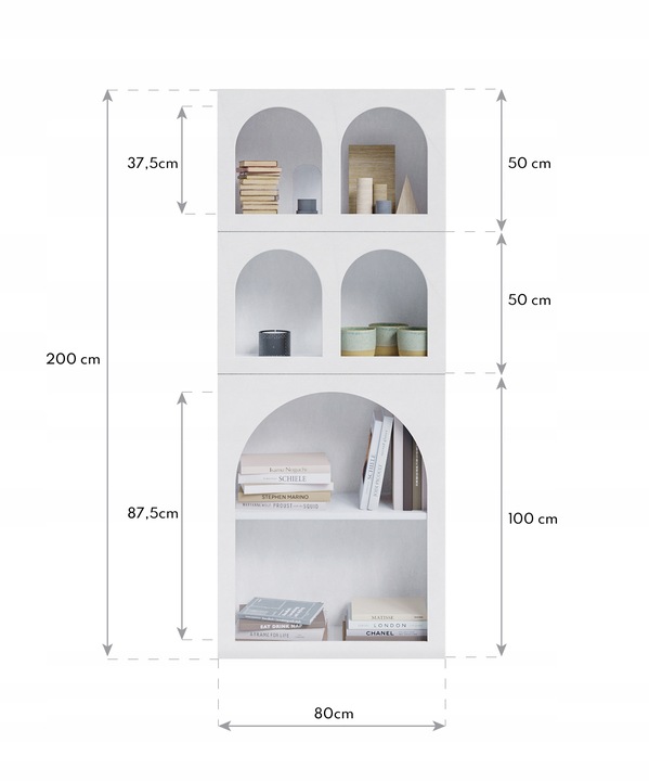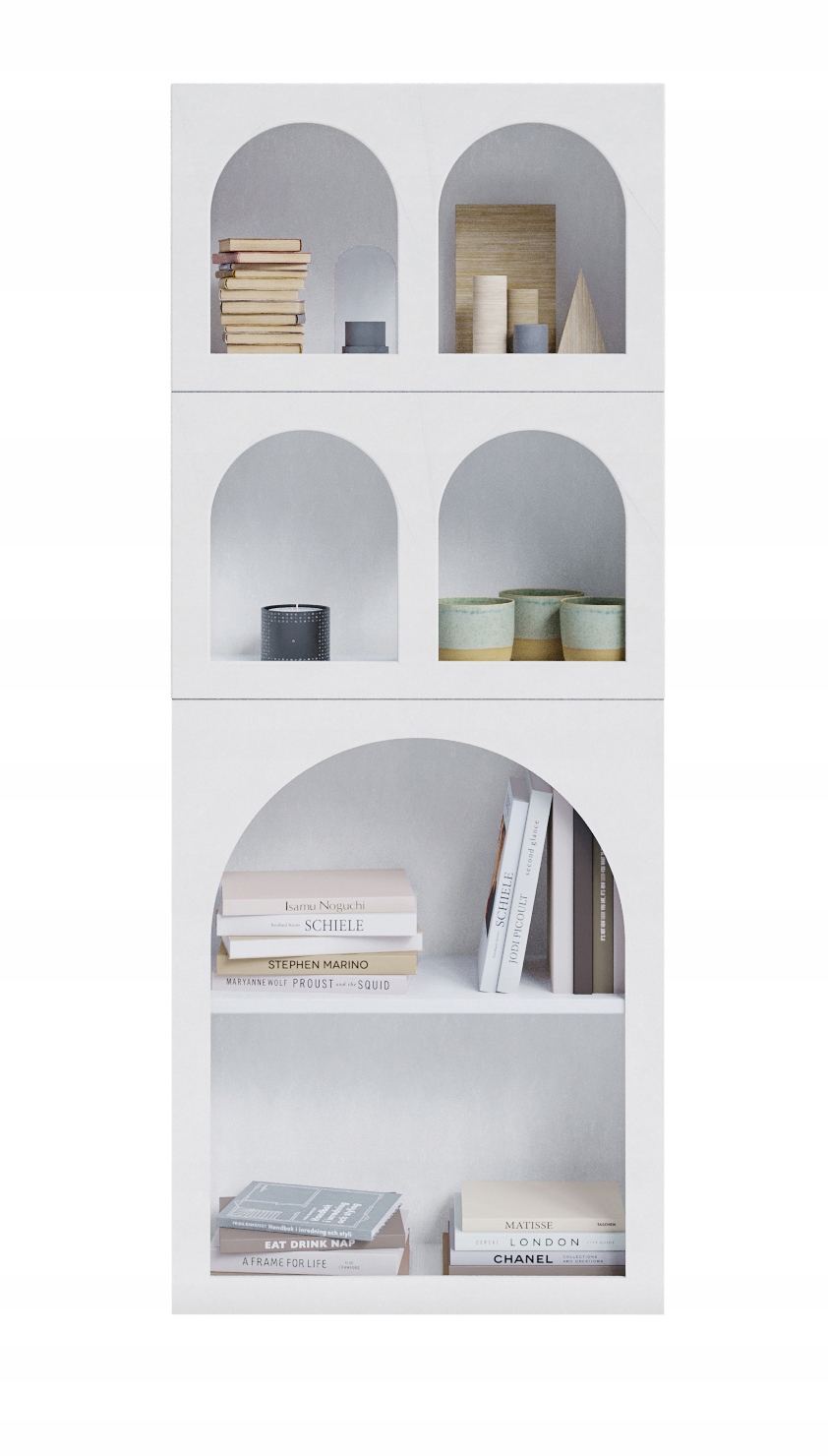 Viis funktsionaalset riiulit sobivad nii kodusesse keskkonda kui ka kontorisse. Hästi läbimõeldud mõõdud tagavad, et regaal sobitub kergesti erinevatesse ruumilahendustesse. Modulaarne ehitus võimaldab elemente omavahel kombineerida, luues unikaalseid konfiguratsioone vastavalt vajadusele. Igal moodulil on iseloomulik esifassaad ja kaarjate süvenditega riiulid, mis aitavad esteetiliselt hoiustada raamatuid, dekoratsioone ja pisiesemeid, lisades ruumile isikupära.