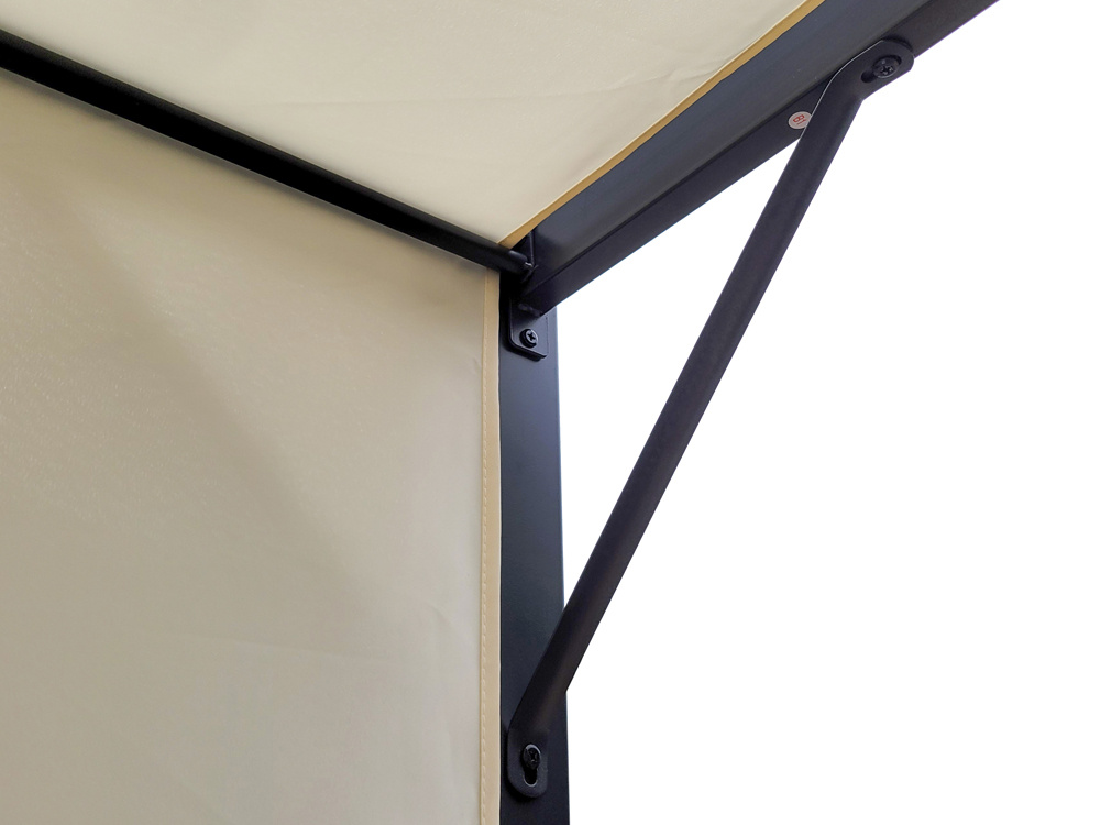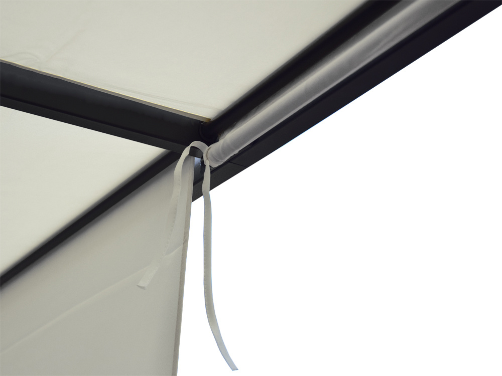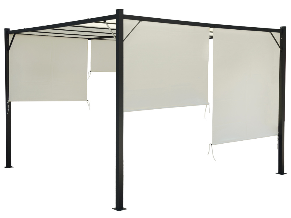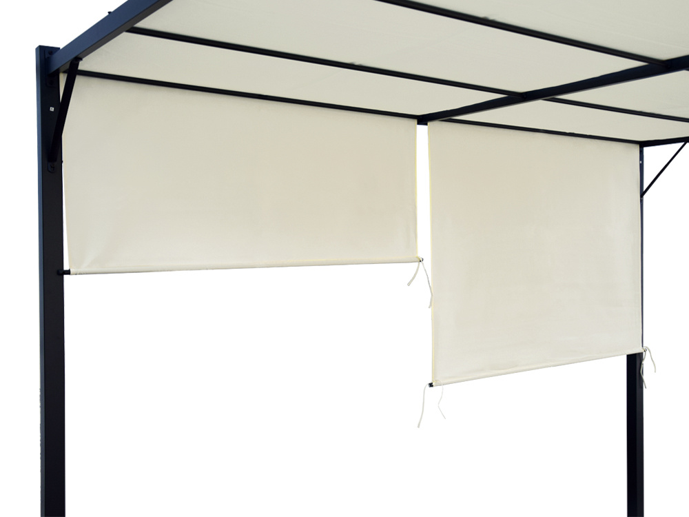 Pergola on varustatud nelja seinaga, millest kahel on beežid rullkardinad, mis on valmistatud kvaliteetsest PVC-kattega polüesterkangast. Rulood saab eraldi alla lasta, mis võimaldab teil konstruktsiooni vastavalt hetkevajadustele kohandada – olenevalt tuule suunast, päikesevalgusest või soovist suurema privaatsuse järele.